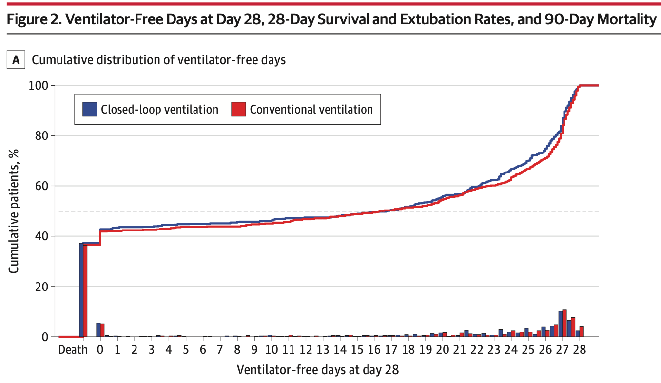 The primary outcome was ventilator-free days at day 28. The result: median 16.7 days in the closed-loop group versus 16.3 days in conventional ventilation (odds ratio 0.91, 95% CI 0.77-1.06, P=0.23). No difference.