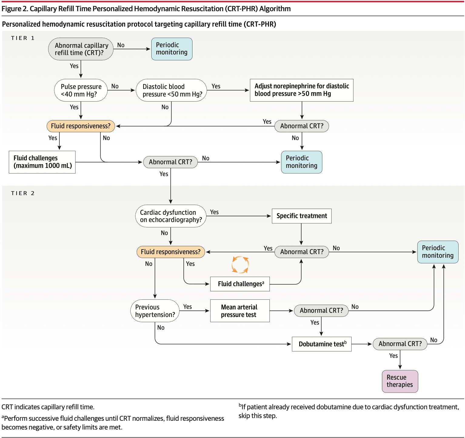 Tier 2 (if capillary refill time still abnormal): Basic echocardiography to assess ventricular function → treat cardiac dysfunction if present → reassess fluid responsiveness → additional fluid boluses if responsive → if chronic hypertensive, trial of higher MAP (80-85 mm Hg) for 1 hour → if still abnormal, dobutamine 5 μg/kg/min for 1 hour
