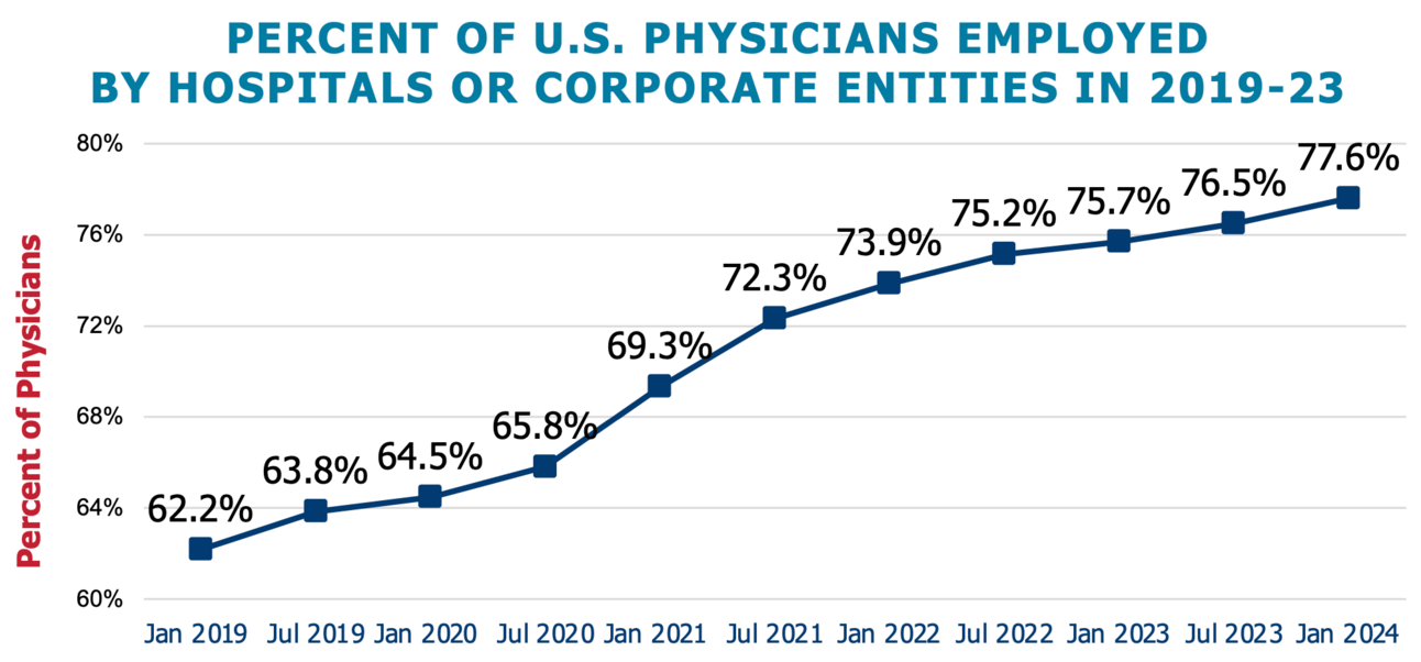 In fact, nearly 80% of U.S. physicians are now employed—either by hospitals, health systems, or corporate entities like insurers, private equity firms, or even retailers. And that number has jumped 25% since 2019.